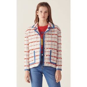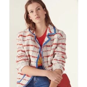 Timeless tweed cropped jacket with contrasting grosgrain trim.