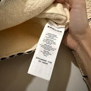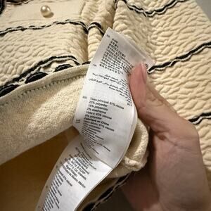 Sandro Infinity Cardigan Sweater in Ecru. Women's Size Sandro 0 = XS / Extra Small. Has a shrunken fit. Features textured fabric, stripe print, shirt collar, long sleeves, two faux pockets with novelty buttons on the chest, straight cut, cropped length, fastened with a button placket, contrast trim detail. 61% viscose, 22% polyester, 15% polyamide, 2% elastane Ruffle: 92% viscose, 8% polyester. Great used condition, no notable flaws. Retail $295.