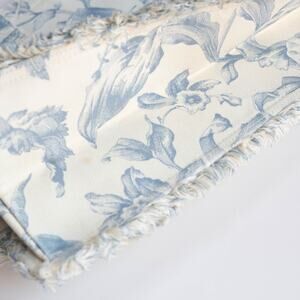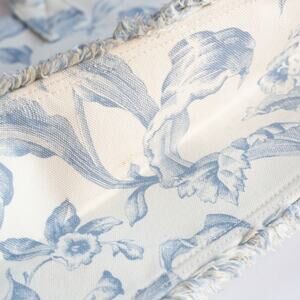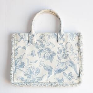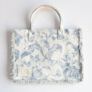 Blue floral print tote. Magnetic button closure. Open pockets. Attached strap (non-removable). 16" W x 13" H x 7" D. Retail: $449