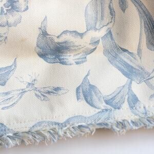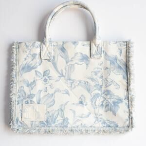 Blue floral print tote. Magnetic button closure. Open pockets. Attached strap (non-removable). 16" W x 13" H x 7" D. Retail: $449
