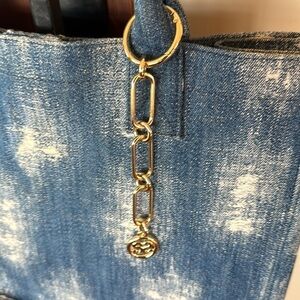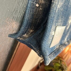 Denim tote. Magnetic button closure. Open pockets. No strap. Imported.