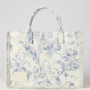 Elegant tote bag featuring a beautiful blue floral pattern on a white background. Perfect for adding a touch of sophistication to any outfit.