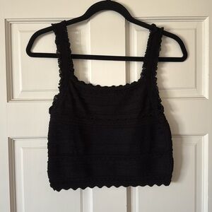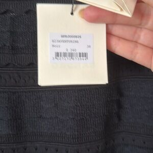 Black crop top and midi skirt. Semi sheer open knit, will need to wear with appropriate under garments/slip. Thick elastic waist band and small slit on left leg. Beautifully made. Material is thick knit and stretchy. Belt NOT included. French size equivalent to size 8 in top and size 6 in skirt.
