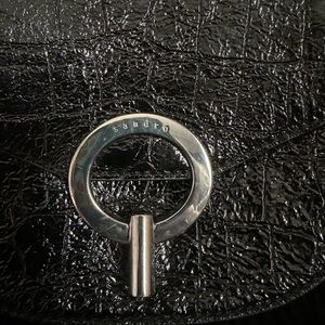 Patent leather exterior, with leather fringe, purple suede interior, and silver hardware!