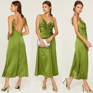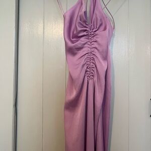 Chic lilac dress with a backless design. Features spaghetti straps and a ruched front. Perfect for elegant outings.