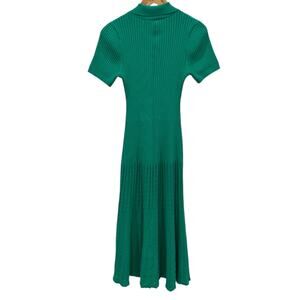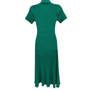 This Sandro dress features a vibrant green hue with a ribbed texture and pointelle detailing, evoking a chic and feminine vibe