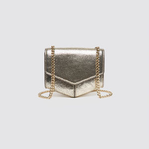 New with tags. 100% calfskin, magnetic top fastening, two compartments, an inside patch pocket and another patch pocket on the back, 16 x 16 x 4cm