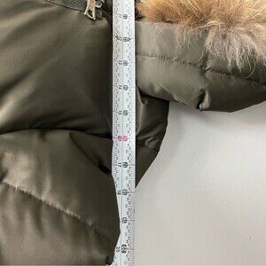 Sandro Marcie Puffer Jacket. Size 3( please refer to photos and size chart ) . Beautiful down puffer from Sandro. The hood has real raccoon fur trim.Hood doesn't detach but the fur trim yes. The bottom of the sleeves are 100% Lamb leather. Excellent used condition. Some very slight wear on leather sleeves and some minor wear close to zipper which is not noticeable