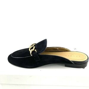 Beautiful Mules im black suede and gold chain hardware. Very comfy , this is an elegant classy look for the ultra chic lady.