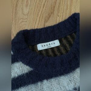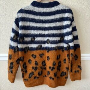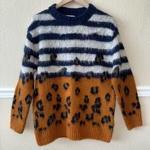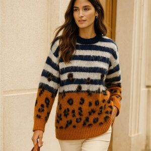 Sandro Mohair Blend Striped Leopard Print Boho Fuzzy Cozy Crewneck Sweater Size