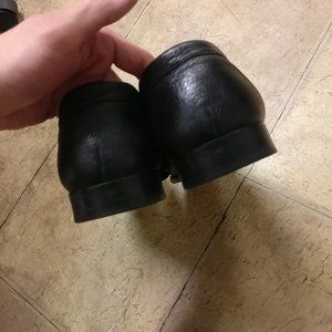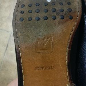 Driver loafer style, but with leather soles with rubber beads. Typical dress loafer type of heels.