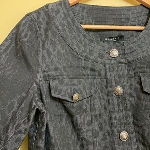 Sandro | Black Gray Animal Print button Up Round Collar long sleeve Jean Jacket NWOT In size small with Button Cuff, Two Faux Chest Pockets.