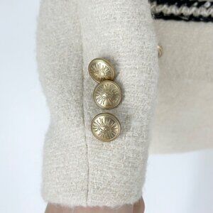 Color: Cream with black trim and gold buttons