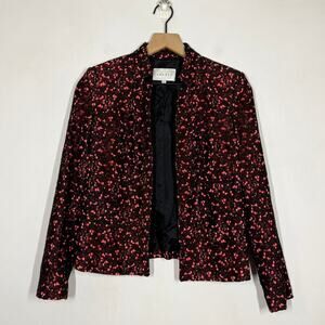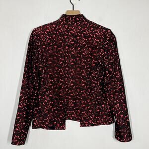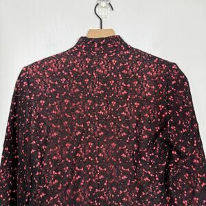 Elegant blazer by Sandro. with a hot pink base layered over with black lace pattern. perfect blazer for work with boss babe vibes.