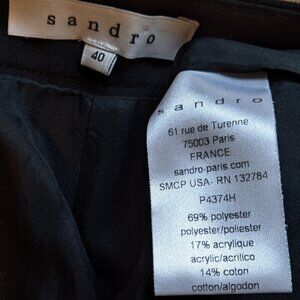 These are Sandro Paris pants in an abstract floral pattern in black, white, pink, and sparkly shiny metallic silver. They are a France 40 aka US size 8, and the last two images show measurements. Front slash pockets, back welt pockets, high-rise, tapered leg, zip fly with hook & bar and button closure. Main jacquard fabric made of 69% polyester, 17% acrylic, and 14% cotton. The waistband is made of 99% viscose & 1% elastane. 100% acetate lining.