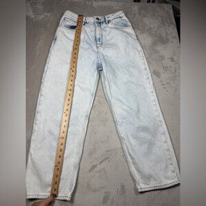 Very light blue bleached washed denim jeans, 100% cotton, wide leg, high waisted, zip fly, causal, contemporary, streetwear