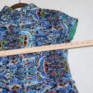 Add a pop of color to your wardrobe with this stunning 100% silk dress by Sandro Paris (brand identified by RN number). Featuring an intricate, psychedelic-inspired abstract print in vibrant blues, reds, and greens, this dress is a true statement piece. The high neckline and mini silhouette give it a modern cheongsam vibe with a cool, artsy edge.