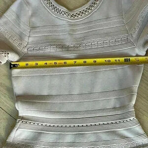 Short sleeve, crochet design, fits nice and snug. Align design, mid length, in very good condition. Size is 42 European, which equals to be an M in USA size.