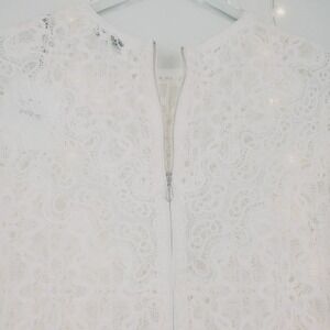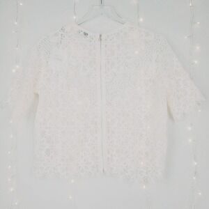 Featuring: Crew neck, short sleeves, Guipure lace allover details, Scalloped eyelash trim, Exposed zippered back, Semi sheer, No stretch material, Victorian style.