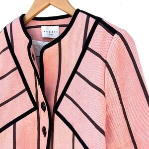 Step into Parisian sophistication with this striking Sandro Paris bouclé jacket. Crafted from a linen-cotton blend, this pink cropped blazer features sharp black piping and a structured silhouette that blends modern elegance with timeless prep. The minimalist hook-and-eye closure keeps the front clean while letting the bold design shine. A must-have piece for anyone who loves upscale streetwear, quiet luxury, or statement tailoring. Perfect for styling with high-waisted jeans or tailored trousers.