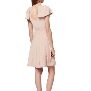 Sandro Paris Atelier Edwin Flutter Sleeve Knit Dress is a dreamy smooth stretch knit with eyelet openwork detail, all-season stylish and fun. Pullover style, tie detail at back of neck, pretty flutter cap sleeves, v-neck, pleated-look skirt, fit & flare silhouette, knee(ish) length. Has stretch. Pretty soft blush pink color. It’s form-adjusting, feminine, and flirty! Great day to evening dress. Black photos just to show style. Listing is for pink color.