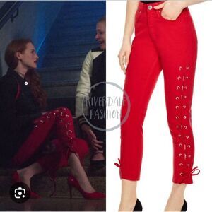 Sandro Paris Hadera Lace Up Skinny Ankle Jeans in Bright Red, 100% Cotton, As seen on the Riverdale show.