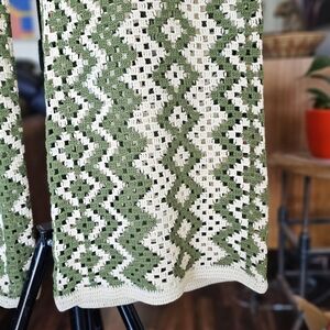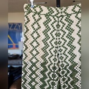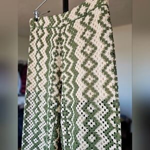 Crochet-style knit trousers with a contrasting geometric print and an elasticated waist. Partial lining. Perfect for spring and summer!