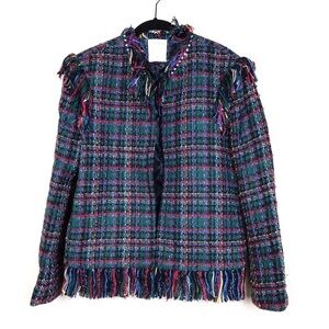 "Playful tweed check jacket with fringes along neckline, shoulders, and hem. Roundneck. Long sleeves. Hook-and-eye front. Lined"