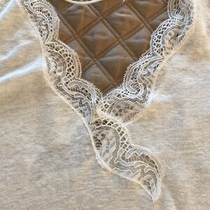 Sandro Paris woman’s 100 linen top with long sleeve and lace detail. Features v neckline front & back, self tie at back neck, lace detail on neckline & shoulder.