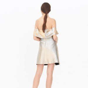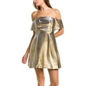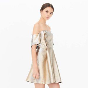 BRAND NEW, NEVER WORN - Shine brighter than a fireworks display this holiday season in Sardro's metallic Palacio Dress. This dress is crafted from lamé fabric and has a beautiful metallic shimmer that shines in shades of warm gold to cool silver depending on the lighting. It has a lovely straight neckline, a flattering A-line skirt, and a 100% cotton lining for extra comfort. It really is stunning! Cut so that it sits off-the-shoulder, the party-ready mini boasts glitz and glamour in abundance. Style with black heels and over-the-top earrings for a look worthy of a new you.
