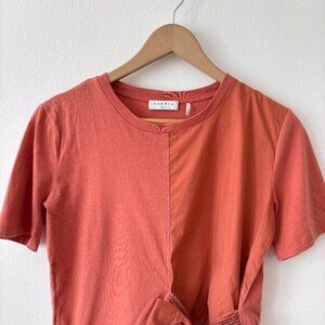 Sandro Paris Node Bow Detail Asymmetric Ruffled Hem T-Shirt in Terracotta Size S