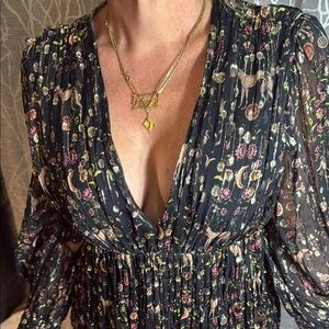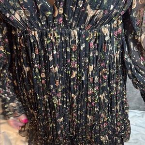 Sandro Paris Pleated Hound Print Metallic Mini Dress in Size 38 (US 6). This stunning cocktail dress features a whimsical hound print with shimmering metallic silver accents throughout. Designed with sheer long sleeves, elasticated cuffs, a plunging V-neckline, and a flattering empire waist that flows into a pleated skirt. The lightweight chiffon overlay is lined for comfort and coverage. Perfect for evening events, holiday parties, or special occasions.