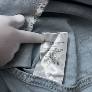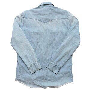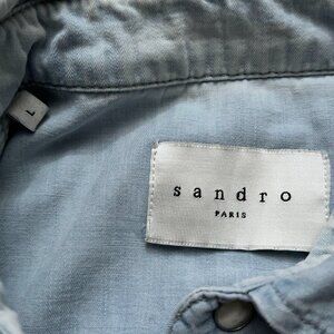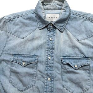 Sandro Paris Shirt Mens L Long Sleeve Denim Pearl Snap Button Distressed Blue