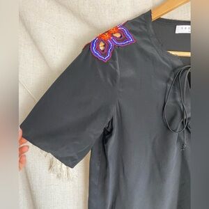Sandro vibration silk top with lace up neck and cutout embroidered patches on shoulder.