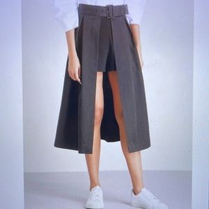 In excellent condition Sandro Paris Viveta Pleated Midi Skort in Black. This layered midi skort lends a contemporary finish to your daily rotation, imagined in soft cotton the midi length design boasts a high slit which reveals a pair of shorts for a tailored finish. Attached belt, side pockets size 2