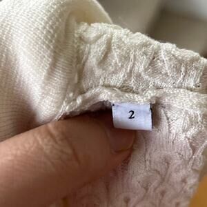Excellent condition. Creamy white, collared short sleeve babydoll style with textured upper. Faux pearl buttons.