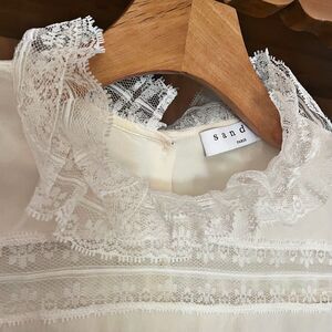 Sandro Paris ivory Silk Flutter Blouse Top Sz 1 Small Lace Trims Ruffled Neck