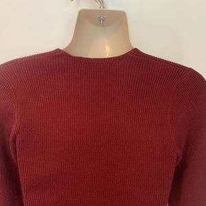 Sandro Paris lace up ribbed knit sweater in merlot. It is sized as 2 which according to their website equates to US size M. V-neck lace up. Long sleeve. Ribbed knit of 41%wool/41%acrylic/16%nylon/2%elastane that stretches to your figure. Measures approximately 12.5" armpit to armpit. . Sweater is in like new condition with no signs of wear.