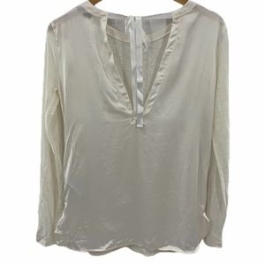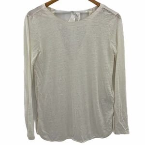 Round neck, long sleeves, semi-sheer, silk back, keyhole at back, curved hem