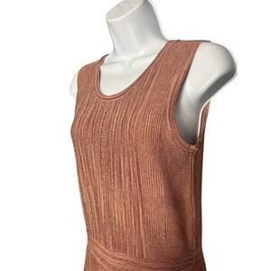 Elevate your wardrobe with this gorgeous Sandro Paris sleeveless knit dress. The beautiful pink hue is shot through with shimmering metallic thread for a subtle, sophisticated sparkle. Features a ribbed bodice and a finely pleated A-line skirt with a flattering banded waist. Perfect for a cocktail party, dinner out, or a chic day look.