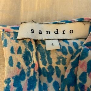A vibrant blue and pink Rebelle cheetah graphic Sandro Paris woven silk dress with an open back. Size 1. French label. V-neck. Open cutout on back. Front zipper closure. Elastic cinched waist. Dress is lined. 100% Silk. Lining is polyester.