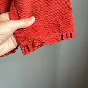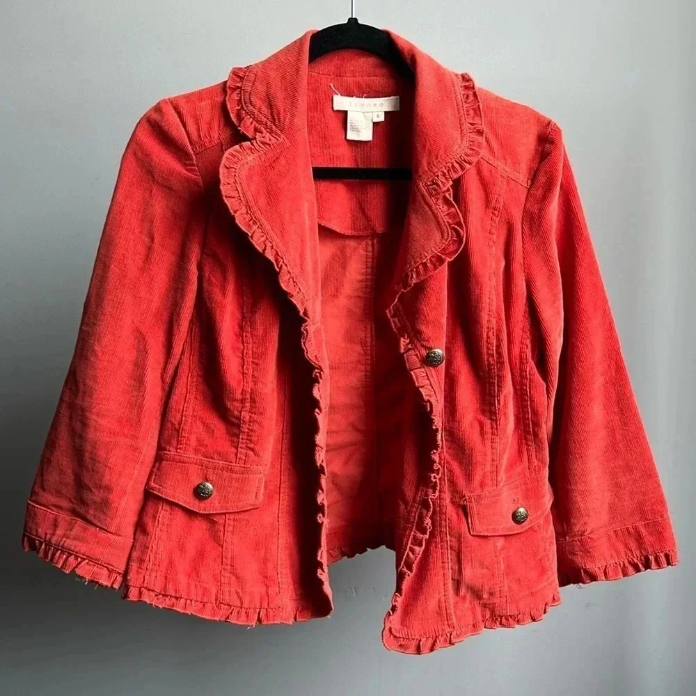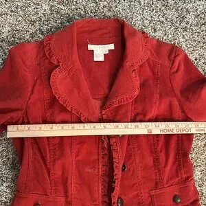 Stylish red jacket with ruffled edges. Button closure. Perfect for layering.