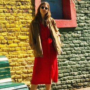 Sandro midi silhouette with red tiger jacquard print, belted. Really hard to get a good picture of the print. In really good condition, size 2.
