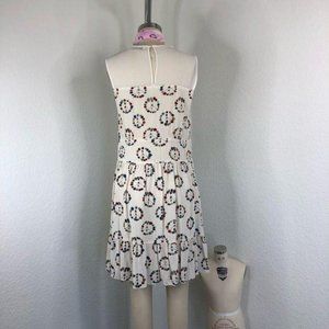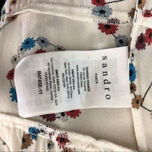 The girlish design makes it an easily styled addition to your casualwear collection; play to its seventies reference by wearing it with a fringed suede jacket. Sandro silk dress. Concealed button. Round neck, textured neckline, sleeveless, structured waistline, layered hem, cut out at back neckline, all-over floral peace sign pattern. 100% silk; yoke 100% polyester; bias 100% silk.
