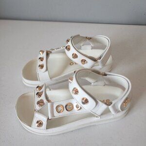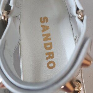 "NEW" Stunning White Leather Gold/Rose Gold-tone Studs & Rivets Elympia Sandals By Sandro Paris. Adjustable Velcro Strapping/Closure, Molded Cushioned Foot Bed, Suede Sides, Flat Rubber Soles, Metal Logo at Heel Strap, Leather Upper, Lining & Foot Bed, New, never Worn, Only Tried On:) Rt.360.00 approx. Size 36/ 6, Foot Bed Measures 8.5" for Reference.