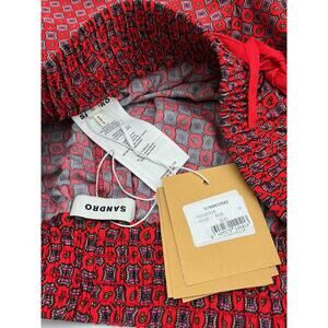 Sandro 'Scarf' Red Viscose Print Shorts Size 36: scarf motif, side pockets, flared shape, plain hem, an elasticated waistband with ties, measurements: 13 inch width x 14.5 inch length.