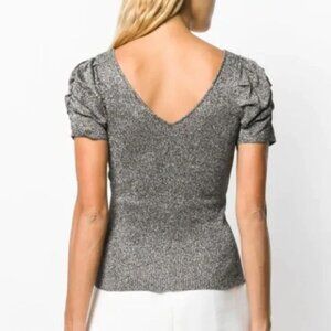 Sandro Silver Metallic Ribbed Short Puff Sleeve V Neck Sweater Size 3 (L)