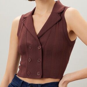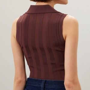 Brown knit (54% viscose, 44% polyamide, 2% elastane). Vest. Sleeveless. Collar. Front button closure. Imported.