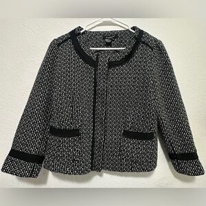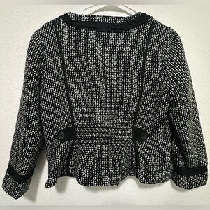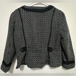 Elevate your style with this chic black and white jacket. Perfect for any occasion, this piece offers a sophisticated look with its classic design.