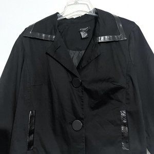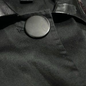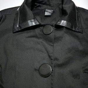 Faux patent leather trims on collar, cuffs and side slot pockets.